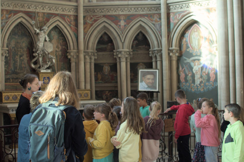 Cet automne, les apprentis fabulologues de l'école Argouges de Bayeux sont allés chercher les traces de la dragonne Aerin au Musée d'Art et d'Histoire Baron Gérard, à la cathédrale et au cimetière militaire de Bayeux.